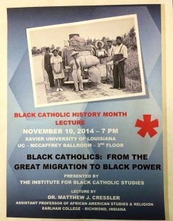 My post today falls in the “shameless plug” category. I am due to lecture at the Institute for Black Catholic Studies at Xavier University of Louisiana on Monday, November 10th. The title of my talk is “Black Catholics from the Great Migrations to Black Power,” something I have thought quite a bit about for the past few years. Nevertheless (or, perhaps precisely for this reason), I’ve been struggling to capture the full significance of this story in just 45 minutes. So my post today offers some of the musings that have been running on repeat in the back of my mind as I prepare to share this story.